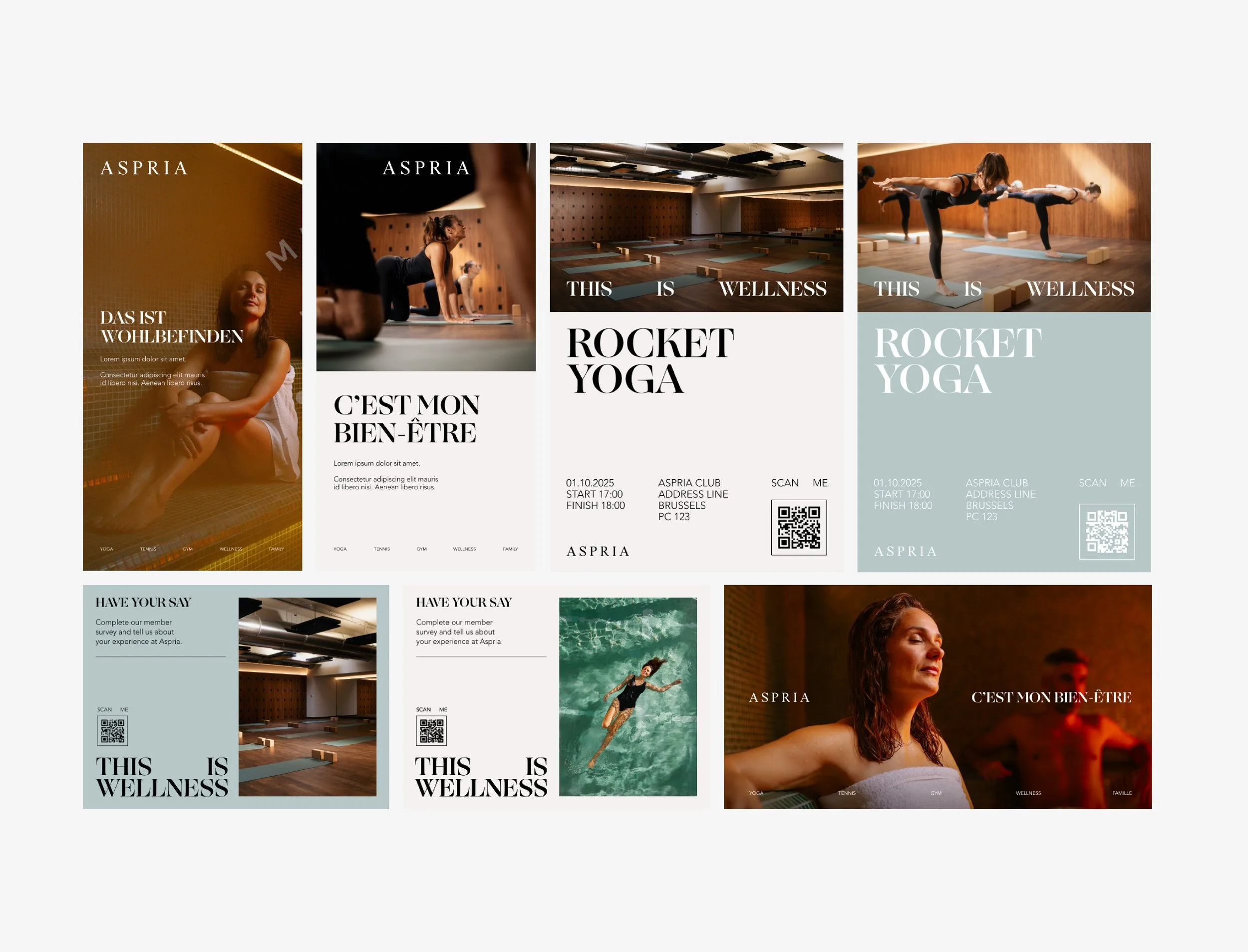 As the campaign evolved, we strategically refined the naming from Wellness to Wellbeing, a deliberate shift to ensure clarity, nuance, and translatability across Aspria’s multilingual audience. This linguistic precision informed the creation of This is Wellbeing as the core campaign line, offering a clear, ownable platform that could flex across channels while staying rooted in the brand’s promise.
